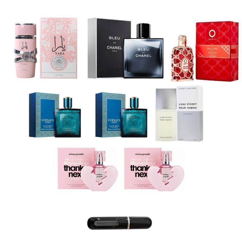 8 PERFUEMES YARA ,BLEU ,ORIENTICA AMBER ROUGE ,2 EROS ,ISSY MEN ,2 THANK U NEXT MAS UN PERFUMERO RECARGABLE